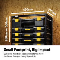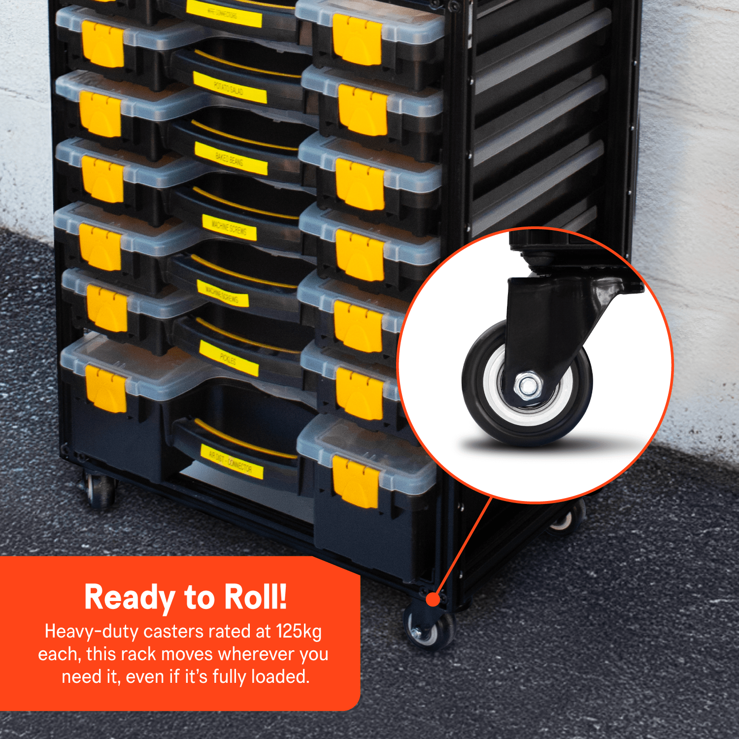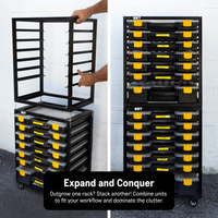 - Two sizes available: Tall (holds 14 bins) and Short (holds 8 bins)