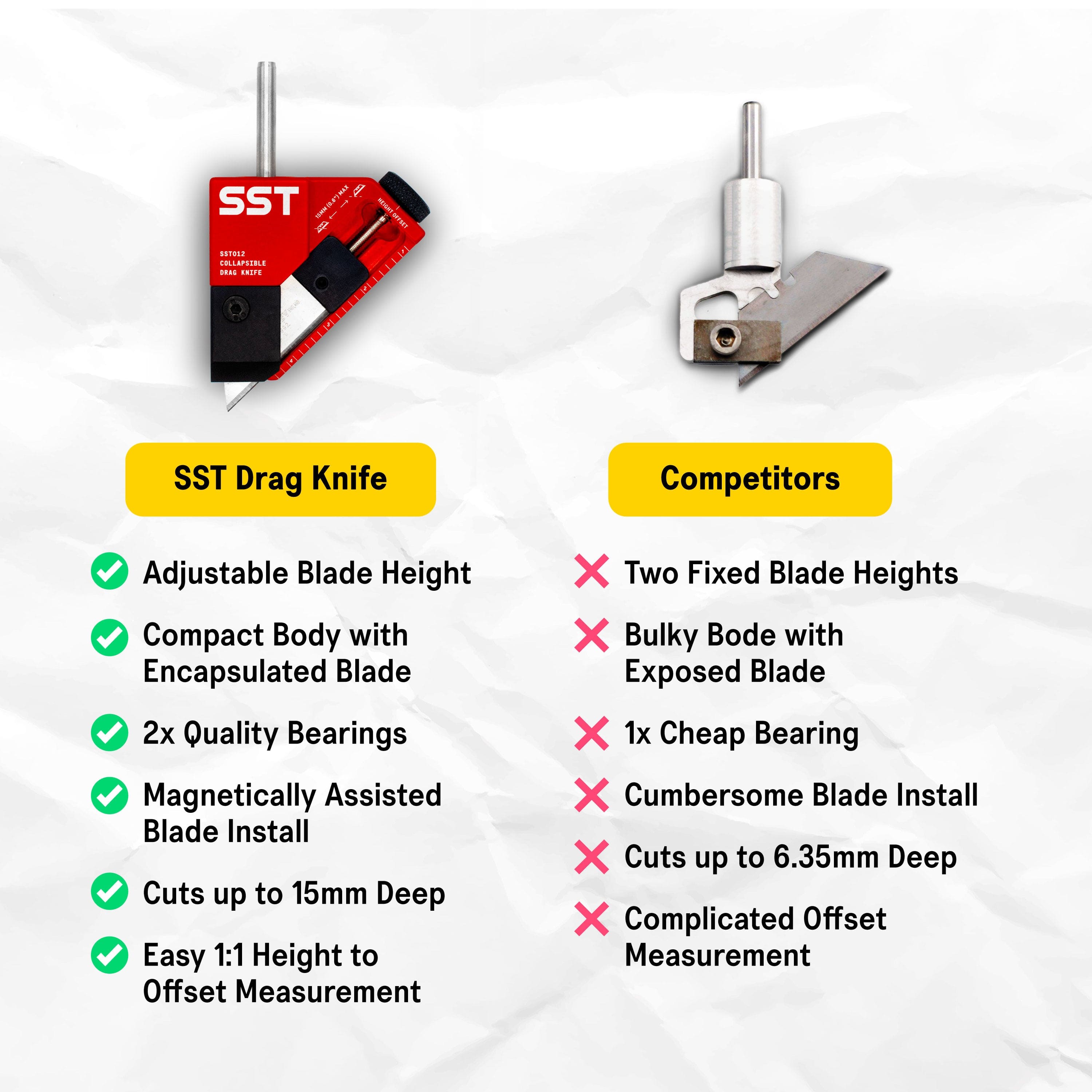 I have several dragknives and this is by far the best. The offset is easily calculated and if you not quite cutting you can just tweak the depth screw and get great results. I have cut 0.007 to coroplast all in one pass. Previously I did these same materials in two passes. Great price too.
