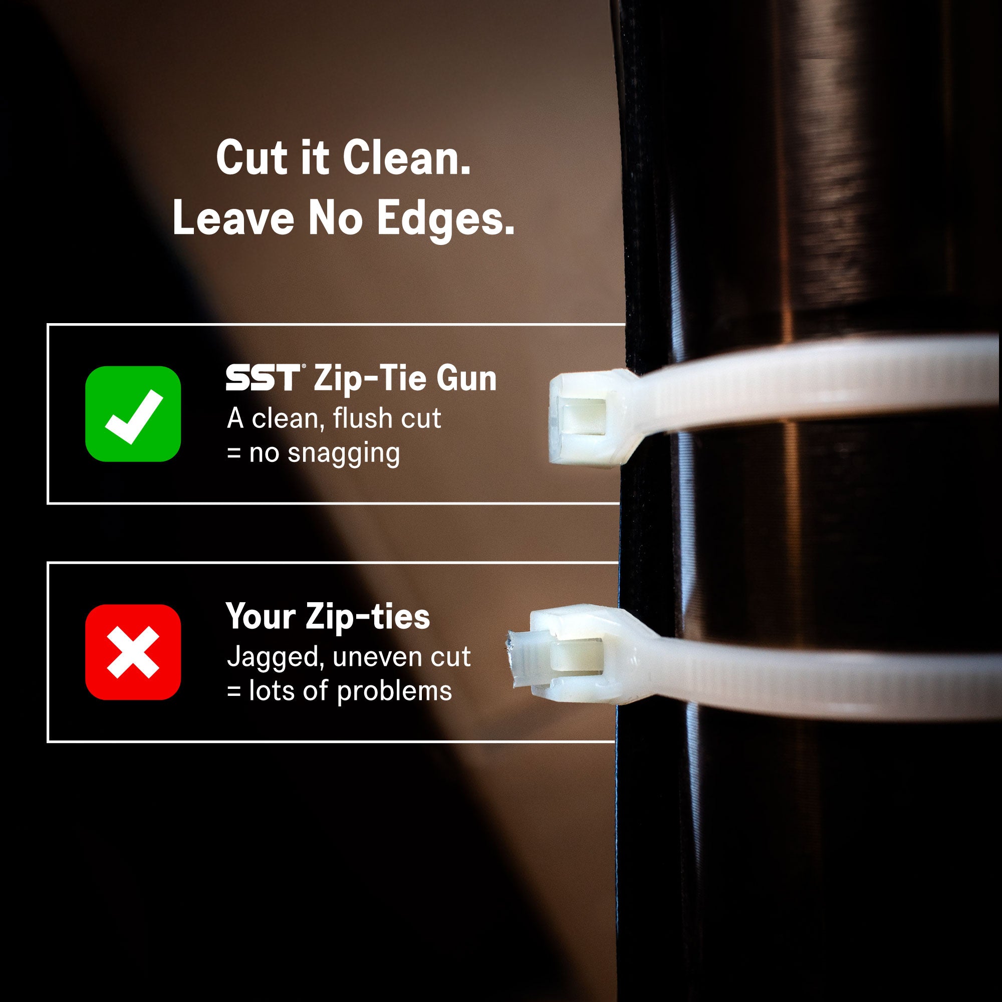- Get through zip ties 25x faster, without variation in tension or sharp edges left behind