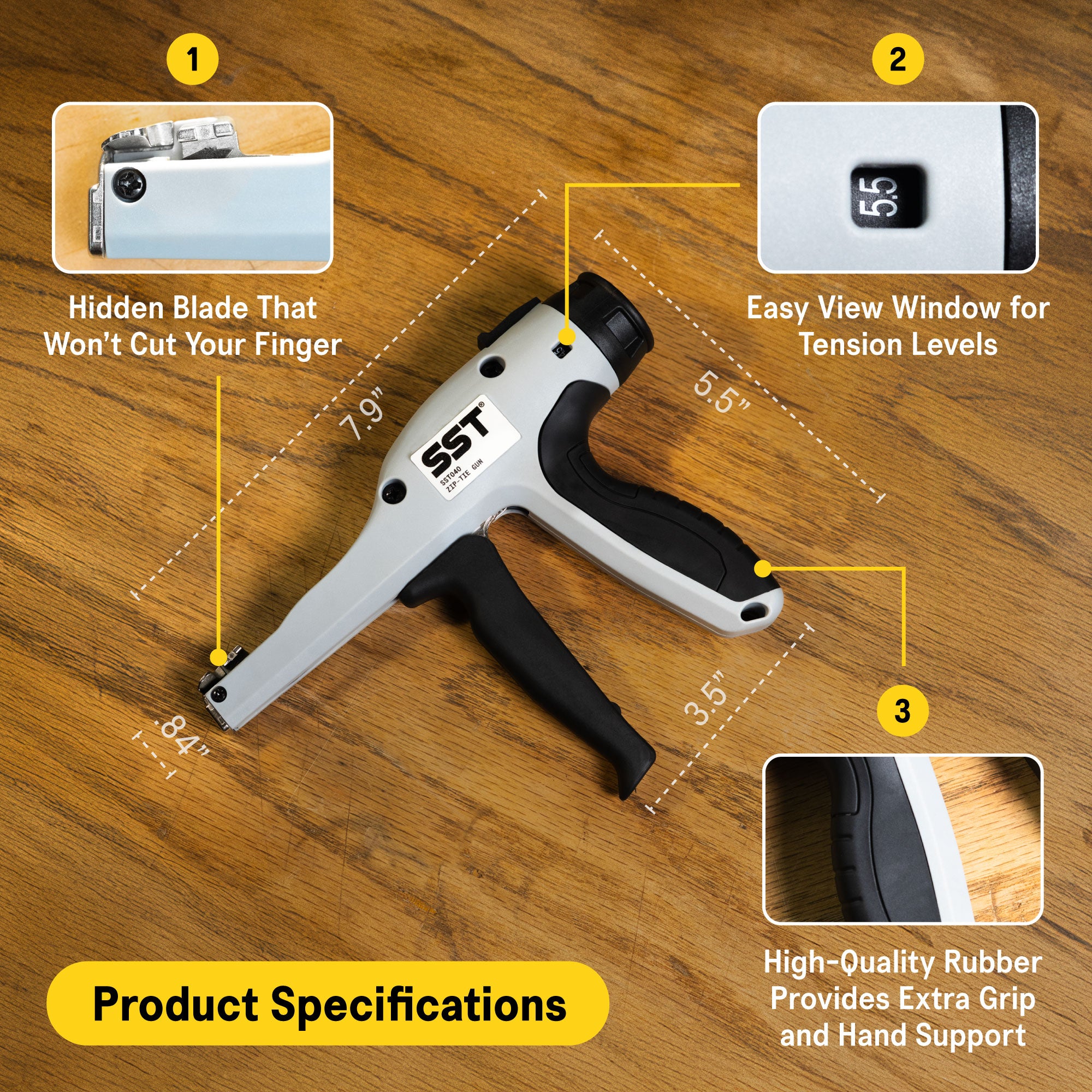 - Glass-filled nylon casing and TPU grips make this a weapon-grade zip tie gun that’s tough and precise.