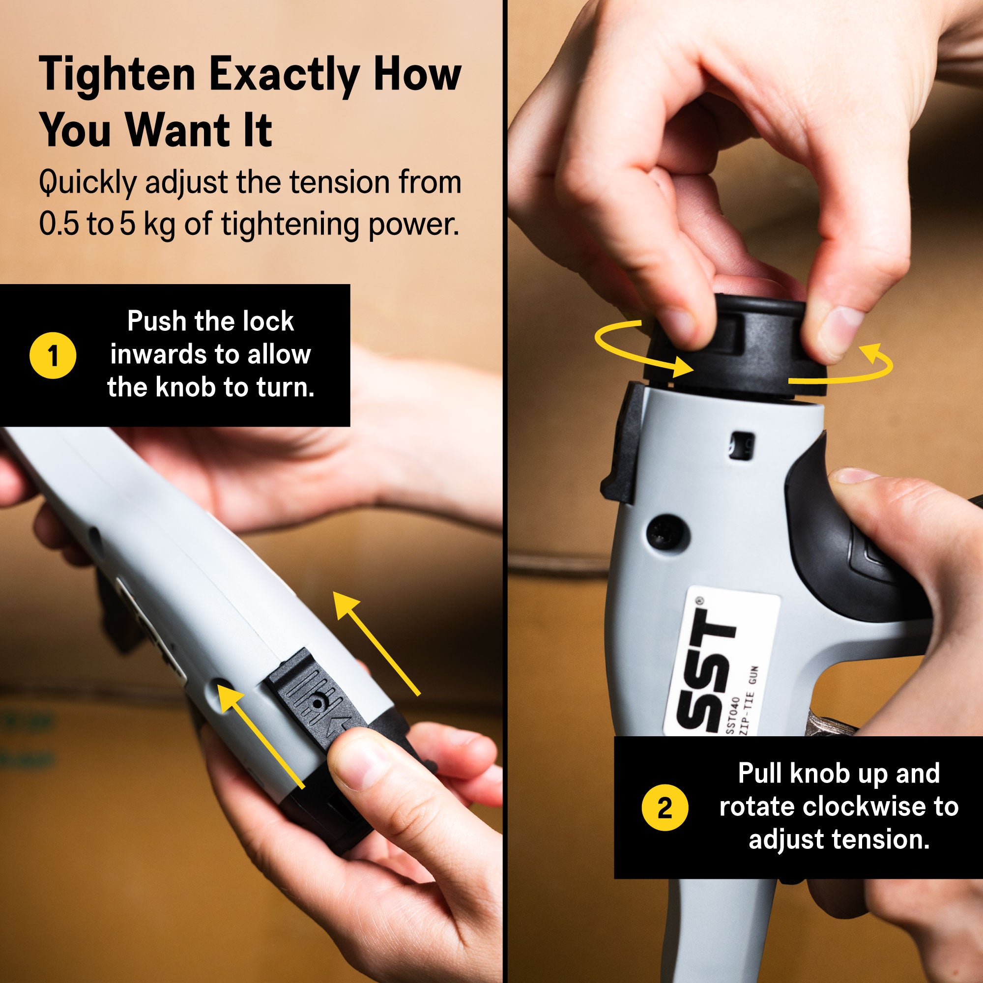 - Tighten securely and trim cleanly with one smooth trigger pull.